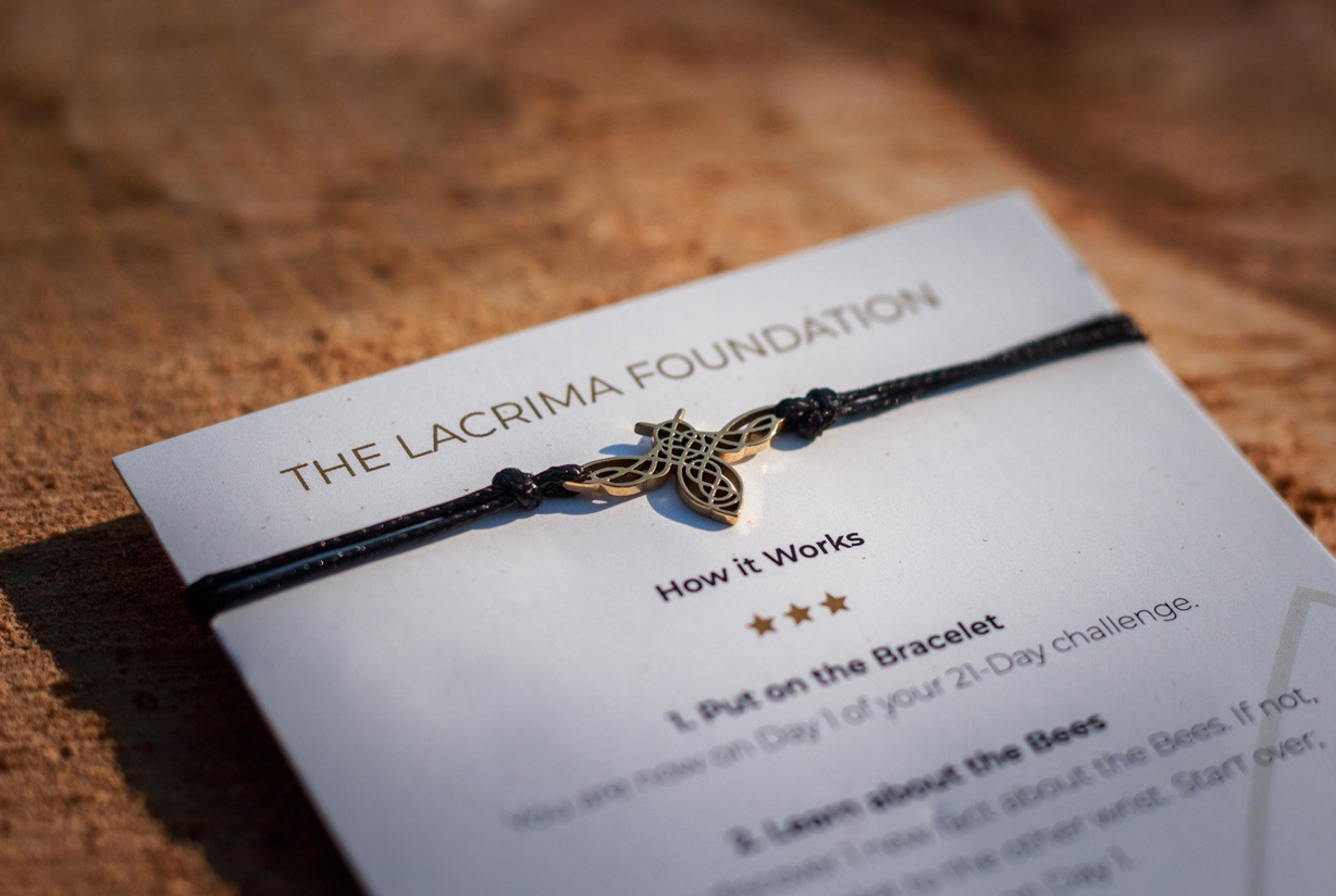 Limited Edition. Wild Honey Bee Silhouette Handmade Mini Bracelet. To order your Lacrima Challenge Bracelet, follow the process below. Please allow up to five working days for delivery. For all orders enquiries or if the destination of your purchase is outside the UK, please email info@lacrimafoundation.org and we will be glad to assist.